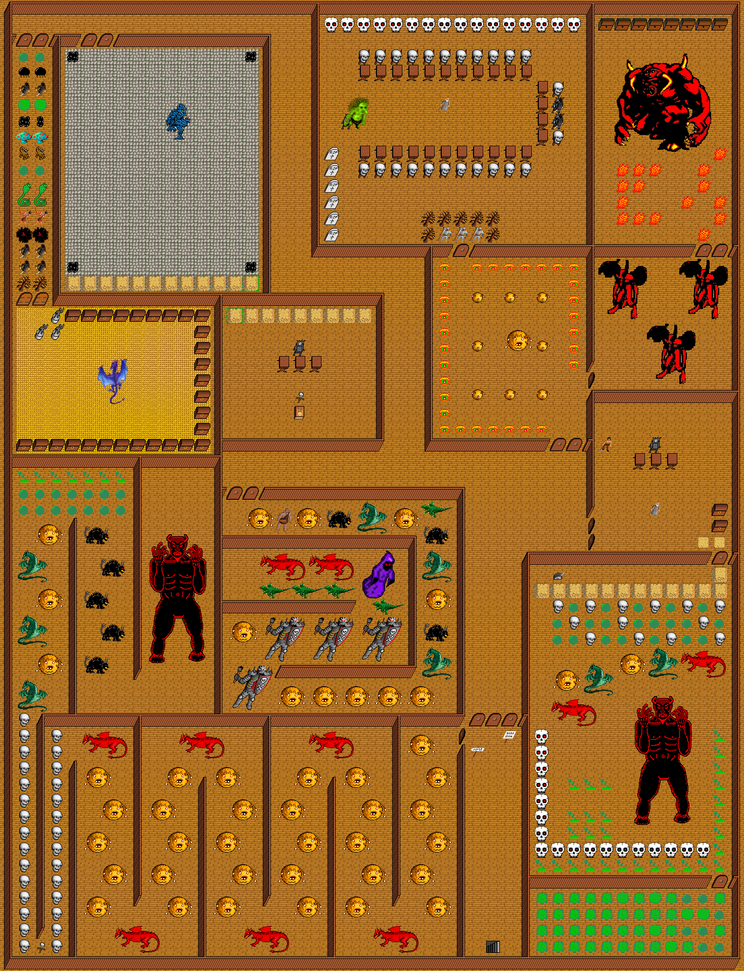 Monsters on map (level from 1 to 80): acid sphere, behemoth, beholder, big demon, black pudding, blob, castle guard, chinese dragon, demilich, Dominique H., dragon, Dread, fire elemental, Francis J., Francis Snr., giant cobra, Gilbert L., green slime, grimreaper, hill giant, Jean Foulon, nightmare, rustmonster, sage, skull, slime, The Guard, The Mascot, titan, tree, troll, violent fungi, wild pyromaniac, wizard, wyvern, Yves P..